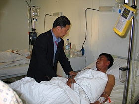 昆都士距喀布爾雖僅有三百多公里,但由于道路遭多年戰(zhàn)爭(zhēng)破壞,陸路要走八個(gè)小時(shí)。孫大使、徐武官和馬斗馳武官助理一行三人于上午10時(shí)登上聯(lián)合國(guó)僅有十幾個(gè)座位的小飛機(jī),11時(shí)10分抵達(dá)。這起重大恐怖襲擊事件震驚了世界,也牽動(dòng)了黨和國(guó)家領(lǐng)導(dǎo)人的心。孫大使臨赴工地前已得到胡錦濤主席、吳邦國(guó)委員長(zhǎng)和溫家寶總理的指示,要求大使館全力搶救受傷同胞,妥善處理善后事宜。