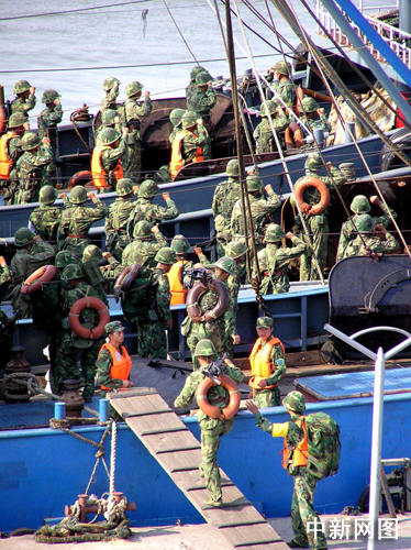 三時(shí)左右,隨著三發(fā)紅色信號(hào)彈升空,位于廈門灣南岸的漳州港海面上,展現(xiàn)出一幅新時(shí)期地方政府和民眾擁軍支前的波瀾壯闊畫卷:民兵船運(yùn)分隊(duì)快速集結(jié)并與部隊(duì)對(duì)接,武器裝備和人員有條不紊地進(jìn)行裝載;海上警戒、勤務(wù)保障、通信、供油供水等分隊(duì)同時(shí)跟進(jìn)保障,醫(yī)療救護(hù)所、船舶維修與器材供應(yīng)站等也相繼開設(shè)進(jìn)行保障;面對(duì)阻撓人民解放軍部隊(duì)裝載的“敵機(jī)”,民兵高炮和導(dǎo)彈分隊(duì)迅速實(shí)施對(duì)空射擊;一條條水龍迅速撲滅中彈著火的船只……