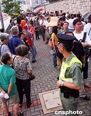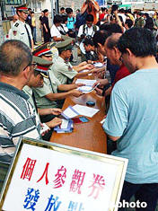 事前,駐港部隊已預(yù)先公告將于今日上午分別在港島中環(huán)軍營、九龍槍會山軍營和石崗軍營設(shè)點派發(fā)個人參觀券。一萬五千張參觀券中,個人券有一萬二千張,其余為團體券;市民每人最多可領(lǐng)取三張個人券。