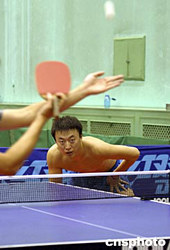 七月三十日,中國國家乒乓球隊(duì)主力隊(duì)員馬琳正在河北正定乒乓球訓(xùn)練基地赤膊上陣,刻苦訓(xùn)練。中新社記者:張勤