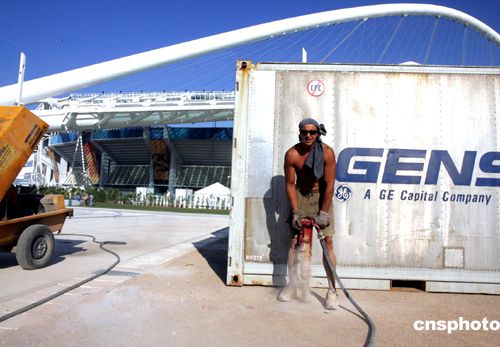 (當(dāng)?shù)貢r(shí)間)二○○四年八月二日上午,一名鉆工在希臘雅典奧運(yùn)會(huì)主會(huì)場外冒著烈日安裝配套設(shè)施,雅典奧運(yùn)會(huì)主會(huì)場建設(shè)工程已經(jīng)收尾。中新社記者:任晨鳴