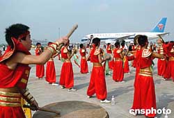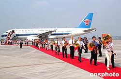 廣州新白云國際機場遷建落成慶典二○○四年八月二日在新機場停機坪舉行。一架空中客車在新機場降落并停在慶典會場,一百二十名新機場的建設(shè)者手棒鮮花走下飛機走向會場參加落成慶典。作者:羅仰明