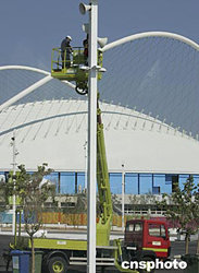 雅典奧運會主體育場外的收尾工程當?shù)貢r間8月13日緊張進行,工人們冒著烈日安裝擴音設施。中新社記者:任晨鳴