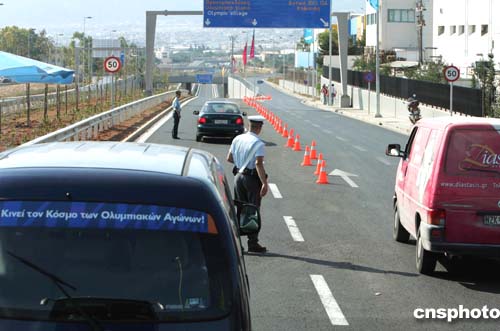 (當?shù)貢r間)二○○四年八月三日,位于希臘雅典市郊的奧運村入口由警方嚴加把守。中新社記者:任晨鳴