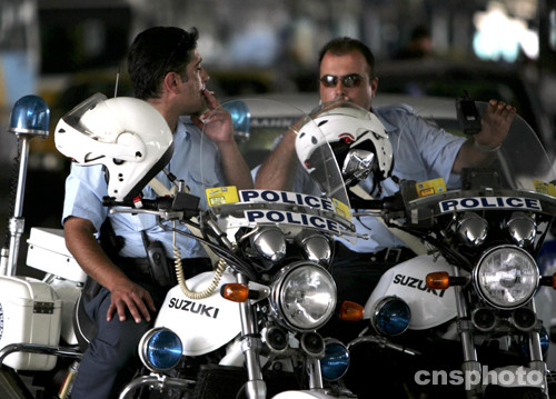 當(dāng)?shù)貢r間8月6日晚,兩名為奧運會貴賓開道的雅典市警察在緊張的工作后,哥倆兒小聚抽支煙解解乏。雅典奧運會開支一再超標(biāo),其中投入安保的資金巨大,所有參與的警察通過各種方式的爭取而獲得了較為豐厚的加班費。中新社記者:任晨鳴