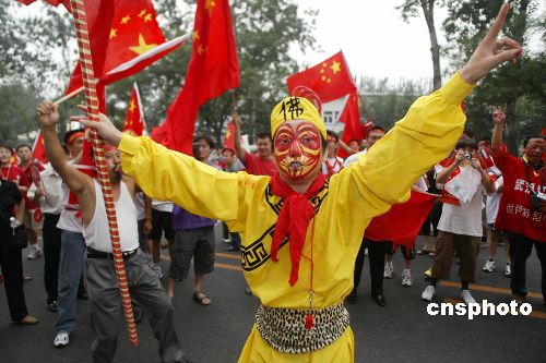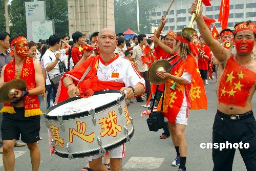 8月7日晚八時(shí),2004年亞洲杯足球賽決賽中國(guó)隊(duì)與日本隊(duì)的比賽將在北京工人體育場(chǎng)舉行,各地球迷提前到達(dá)北京工人體育場(chǎng)為中國(guó)隊(duì)加油。圖為北京工人體育場(chǎng)外為中國(guó)隊(duì)加油的球迷。