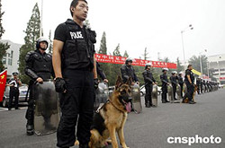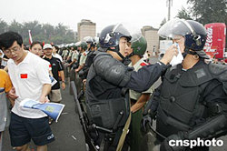 8月7日,在亞洲杯決賽中國(guó)隊(duì)對(duì)日本隊(duì)的比賽開(kāi)賽之前,大批的防爆警察進(jìn)駐北京工人體育場(chǎng),確保賽場(chǎng)的安全。圖為一名防爆警察為同伴擦汗。中新社記者:盛佳鵬