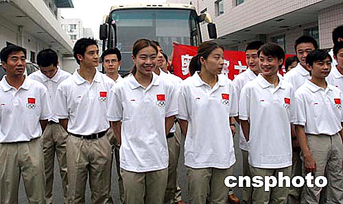 8月8日,中國奧運軍團從北京出征2004雅典奧運會,中國跳水隊在北京集合準(zhǔn)備出發(fā)奔赴雅典奧運會賽場。中新社記者:盛佳鵬