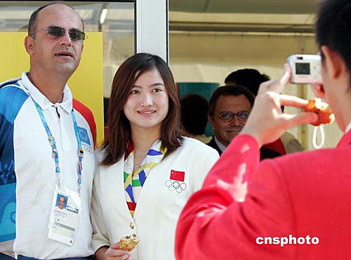 當(dāng)?shù)貢r(shí)間八月九日上午,參加雅典奧運(yùn)會(huì)的中國(guó)代表團(tuán)中漂亮的女選手在選手村亮相,當(dāng)?shù)毓ぷ魅藛T爭(zhēng)相與之合影。中新社記者:毛建軍