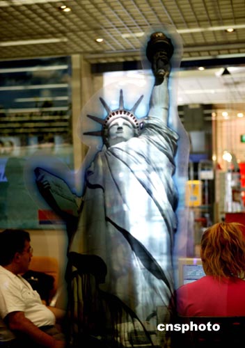 希臘雅典一家旅行社八月九日掛出美國(guó)自由女神畫,奧運(yùn)會(huì)期間該社將為各國(guó)游客提供豐富的旅游服務(wù)。中新社記者:王瑤