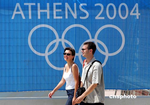 2004雅典奧運(yùn)會(huì)開幕在即,雅典街頭的“奧運(yùn)味道”也越來越濃。圖為一對青年男女經(jīng)過雅典奧運(yùn)標(biāo)志牌。中新社記者:張煒