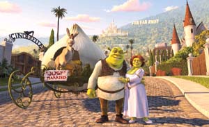 中新網(wǎng)8月11日電 據(jù)京華時(shí)報(bào)報(bào)道,集各種幽默元素于一體的“全球最賣座的3D動(dòng)畫片”《怪物史瑞克2》,昨天起在全國(guó)上映!皹O盡嘲諷調(diào)侃之能事”是影評(píng)人給予這部動(dòng)畫片的普遍評(píng)價(jià)。那么究竟有多少經(jīng)典影片片段被該片移花接木、有多少經(jīng)典形象被該片無(wú)情戲弄?敬請(qǐng)看《史瑞克2》爆笑解讀。