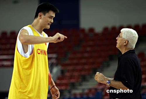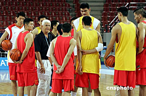 當滿頭銀發(fā)的中國男籃主帥哈里斯姍姍出現(xiàn)在訓練館內(nèi)時,隊員們開始集合,此時比預定的訓練時間晚了半個多小時。在例行的熱身活動后,中國男籃分成黃、紅兩隊進行了幾套戰(zhàn)術的演練。由姚明、易建聯(lián)、李楠、劉煒、朱芳雨等組成的黃隊無疑是中國男籃的主力陣容。
