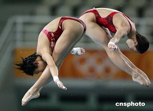 中國(guó)女子十米跳臺(tái)雙人選手李婷、勞麗詩(shī)當(dāng)?shù)貢r(shí)間八月十二日下午在雅典奧運(yùn)跳水賽場(chǎng)進(jìn)行賽前訓(xùn)練。中新社記者:毛建軍