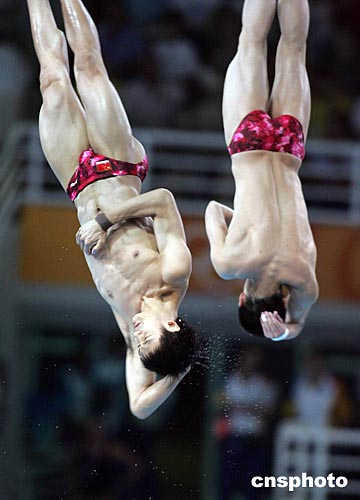 當(dāng)?shù)貢r(shí)間八月十四日晚,中國(guó)跳水隊(duì)田亮、楊景輝在雅典奧運(yùn)跳水館獲得男子雙人十米跳臺(tái)金牌。中新社記者:毛建軍