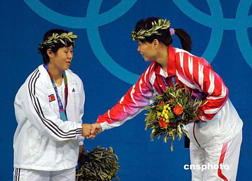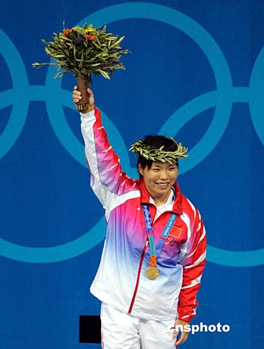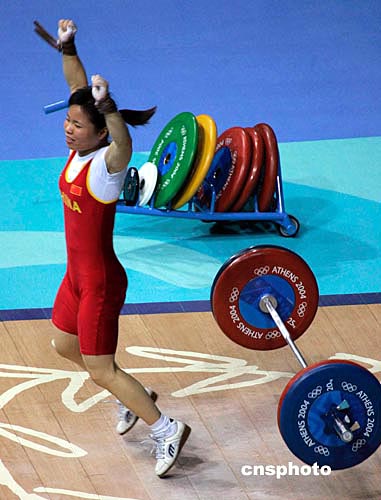 當(dāng)?shù)貢r間8月16日下午,中國女子舉重名將陳艷青在雅典奧運(yùn)女子58公斤級舉重比賽中獲得冠軍,為中國代表團(tuán)奪得第七枚金牌。作者:張煒