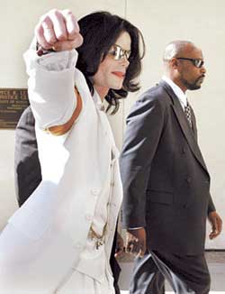 杰克遜這次身著的三件套裝全部為白色,另外他還戴了一個(gè)金色的袖標(biāo)以及腳蹬一雙亮閃閃的白色靴子。他乘坐一輛金色的加長(zhǎng)房車(chē)抵達(dá)法庭門(mén)口,下車(chē)時(shí)受到了100多個(gè)大聲尖叫的歌迷的歡迎。