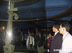 來自世界五大洲三十一個(gè)國(guó)家的百余位海外華僑華人代表,八月十九日上午專程來到展示古蜀燦爛文明的三星堆參觀專程前來參觀。圖為他們?cè)谛蕾p“群巫之長(zhǎng)”青銅大立人像。作者:楊杰