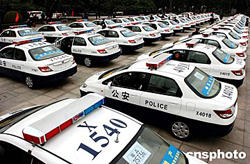 一月五日上午,富力地產(chǎn)集團向廣州見義勇為基金會贈送百輛巡邏警車儀式在中山紀念堂廣場舉行。圖為百輛巡邏警車大展示。作者:陳文