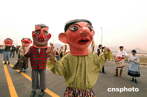 四千多名志愿者和近五萬名澳門市民跨越將于九日正式開通的西灣大橋。行政長官何厚鏵敲響一聲銅鑼,西灣大橋一帶形成一條人的長龍,場面蔚為壯觀。沿途東亞運(yùn)志愿工作者組成的旗隊(duì)演示了多種旗陣,踩高轎,舞醉龍,銀樂,葡國土風(fēng)舞和小丑魔術(shù)表演等,高潮迭起。