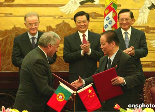 兩國元首在會談后還出席了《中葡關(guān)于經(jīng)濟合作協(xié)議》等雙邊合作文件的簽字儀式。