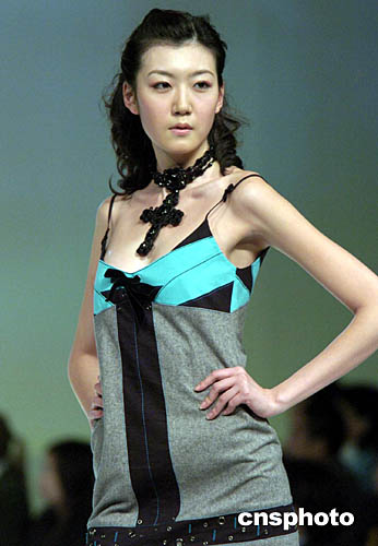 1月19日,香港會(huì)展中心舉行的“香港時(shí)裝節(jié)秋冬系列2005”上,模特演繹“獨(dú)家時(shí)裝表演”專場設(shè)計(jì)師秋冬系列服飾。作者:洪少葵