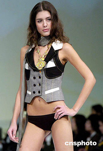 1月19日,在香港舉行的“香港時(shí)裝節(jié)秋冬系列2005”上,一臺(tái)獨(dú)家時(shí)裝表演專場(chǎng)為觀眾帶來青年設(shè)計(jì)師及品牌精選,圖為模特展示GEESSEN品牌作品。作者:洪少葵