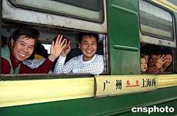 春運拉開帷幕,在廣東中山市打工的外來人員愉快登上廣州開往上海的三五○次春運臨時客車。今年廣州鐵路集團(tuán)春運期間將安排一百四十二對臨客列車,接送返鄉(xiāng)過年旅客。作者:丁勇