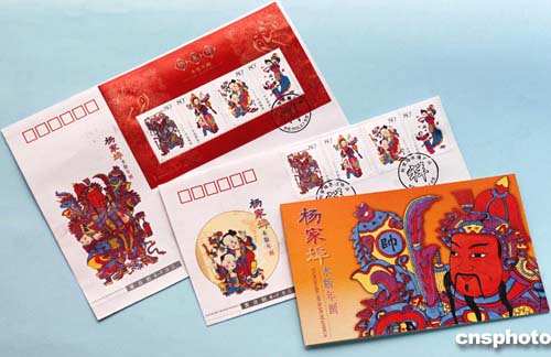 北京市郵票公司為配合國家郵政局于2005年2月1日發(fā)行《楊家埠木版年畫》特種郵票(1套4枚),特設計印制了該郵票的首日封(中)、小全張首日封(左)、郵折(右)等郵品,并將與郵票同日發(fā)行!稐罴也耗景婺戤嫛诽胤N郵票名稱分別為“門神”、“連年有余”、“喜報三元”、“天女散花”,面值均為80分,小全張售價4.80元!皸罴也耗景婺戤嫛痹诿鞔鷷r起源于山東濰坊市濰縣楊家埠,盛于清代,流傳至今,堪稱為民間美術珍品。作者:鄒憲