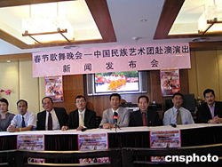 以西藏藝術(shù)家為主的中國(guó)民族藝術(shù)團(tuán),將于2005年春節(jié)期間赴澳大利亞巡回演出,為當(dāng)?shù)厝A人華僑歡度春節(jié)增添喜慶氣氛。澳中文化科技促進(jìn)會(huì)會(huì)長(zhǎng)馮敦平博士(左4)當(dāng)?shù)貢r(shí)間1月27日在悉尼華埠舉行的新聞發(fā)布會(huì)上說(shuō),中國(guó)民族藝術(shù)團(tuán)赴澳巡演首場(chǎng)于2月11日(大年初三)在悉尼市政廳舉行。中國(guó)駐悉尼總領(lǐng)事館文化領(lǐng)事尹亞利(右4)說(shuō),這一被中國(guó)文化部譽(yù)為“國(guó)家杰出文化團(tuán)體”,此后將赴堪培拉參加澳大利亞多元文化藝術(shù)節(jié),并到阿德萊德、墨爾本、黃金海岸和布里斯班等地巡演。作者:劉雨生