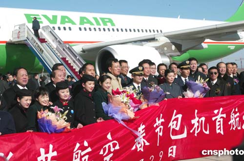 臺灣長榮航空公司的民航班機一月二十九日十二時二十二分飛抵北京首都國際機場,這是五十六年來臺灣民航航班首度飛抵北京。國臺辦主任陳云林、副主任李炳才、國家民航總局局長楊元元、北京市副市長張茅、臺灣國民黨籍民意代表章孝嚴等前往祝賀。作者:滿會喬