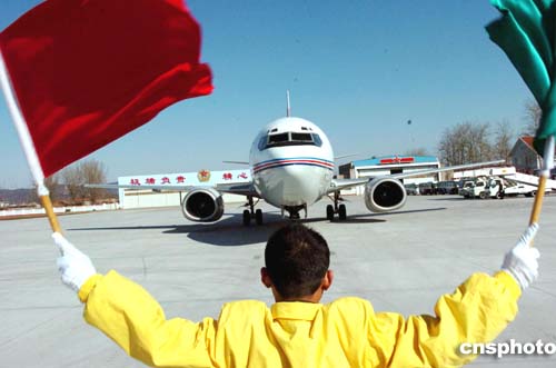 圖為北京西郊機(jī)場(chǎng)地勤工作人員引導(dǎo)安徽省代表團(tuán)所乘飛機(jī)進(jìn)入停機(jī)坪。作者:陳文
