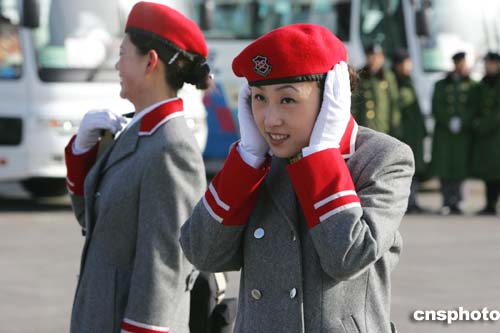 十屆全國人大三次會(huì)議三月四日在北京人民大會(huì)堂舉行預(yù)備會(huì)議,由于冷空氣來臨,負(fù)責(zé)導(dǎo)引代表參會(huì)的禮儀小姐在天安門廣場上顯得“美麗凍人”。作者:湯彥俊