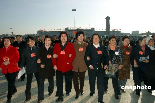 3月4日上午,十屆全國人大三次會議預備會在北京舉行,連任十屆的全國人大代表申紀蘭(右五)、來自山西大寨的郭鳳蓮(左三)等婦女代表引人注目。作者:王輝