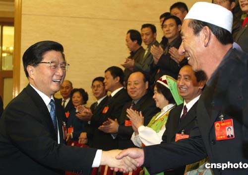 三月十日,全國人大寧夏代表團(tuán)在北京人民大會堂審議全國人大常委會工作報告和兩高報告。中共中央政治局常委、國務(wù)院副總理黃菊參加審議,聽取代表建議。作者:廖文靜