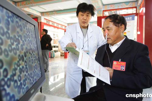 全國(guó)政協(xié)十屆三次會(huì)議三月十一日下午休會(huì)半天,圖為醫(yī)務(wù)人員在友誼賓館駐地為參會(huì)的委員們做免費(fèi)健康咨詢。作者:湯彥俊
