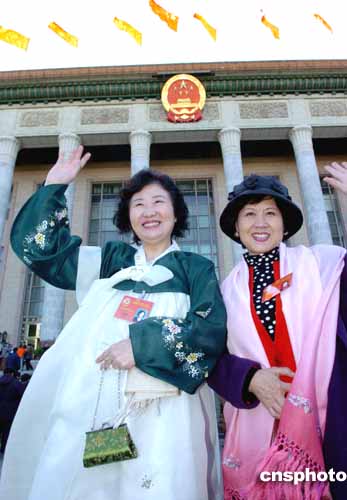 三月十二日下午,全國政協(xié)十屆三次會(huì)議在北京人民大會(huì)堂閉幕,全國政協(xié)委員樸惠善(左)、李承淑(右)愉快地走出會(huì)場。作者:陳文