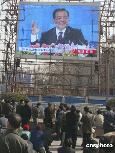 十屆全國人大三次會議三月十四日在北京閉幕,在北京火車站廣場,眾多旅客在大屏幕前觀看國務院總理溫家寶回答中外記者問的現(xiàn)場報道。作者:錢興強