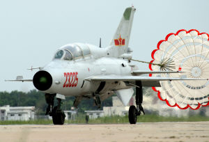 一朵傘花綻開———飛機放出減速傘。