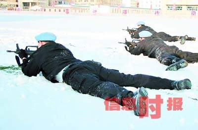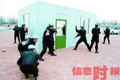 即使如此,他們?nèi)匀灰邮堋疤胤N兵”式的訓練。翻開厚厚的培訓課程表,短短一周內(nèi),防暴隊員們就要學習無線電通訊、反襲擊戰(zhàn)斗、反劫持人質(zhì)、自我心理調(diào)節(jié)等多門課程,進行戰(zhàn)術手語、擒敵拳、丁字棍、盾牌操、穿戴防暴盔甲服及防毒面具的訓練等。
