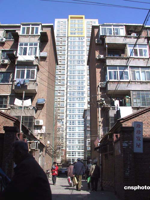 | 三月十八日,位于北京朝陽(yáng)區(qū)雙井附近的和平村,其破舊、丑陋的紅磚平房與身后的舊居民樓和新建的商品樓形成強(qiáng)烈反差。和平村是北京市目前面積最大的“城中村”,當(dāng)局正為改變和平村現(xiàn)狀進(jìn)行拆遷改造。由于北京市房?jī)r(jià)高昂,對(duì)于部分拆遷戶(hù),當(dāng)?shù)卣雅c房地產(chǎn)公司達(dá)成協(xié)議,將向他們提供部分價(jià)格相對(duì)低廉的經(jīng)濟(jì)適用房。作者:納夢(mèng)月