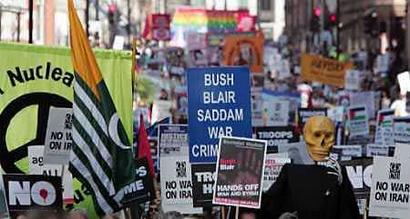 反戰(zhàn)人士以“讓我們的軍隊(duì)回家”為口號,抗議布萊爾政府兩年前派軍隊(duì)入侵伊拉克,并要求英國軍隊(duì)立即從伊拉克撤軍。倫敦市長利文斯通和曾被美國政府關(guān)押在美軍關(guān)塔那摩基地的英國人穆班加向示威民眾發(fā)表了演講。示威者還前往美國大使館前抗議。