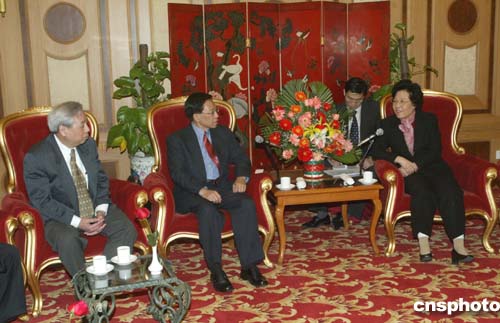 三月二十三日,中國(guó)國(guó)務(wù)院僑辦主任陳玉杰在北京世紀(jì)飯店會(huì)見(jiàn)吳顯揚(yáng)(中)、關(guān)其煉(左一)團(tuán)長(zhǎng)率領(lǐng)的芝加哥中華會(huì)館訪華團(tuán)。作者:史利