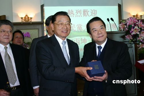 中國國民黨副主席江丙坤一行三十日中午在南京會見江蘇臺商。他表示,臺商在江蘇得到最好的照顧,他們的事業(yè)大部分都相當?shù)某晒。臺商在這里的發(fā)展對大陸的經(jīng)濟發(fā)展也有相當大的貢獻。但是,兩岸人民不但祈求經(jīng)濟的繁榮,更希望兩岸的和平,因為兩岸的和平才能帶來兩岸的繁榮。圖為江丙坤向江蘇臺商贈送禮品。作者:陳旻