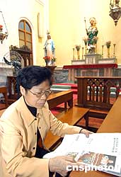 澳門一位女士在主教堂內(nèi)追思教皇,三日,當(dāng)澳門信徒得悉教皇保羅二世離世后,他們紛紛到教堂用各種形式悼念教皇。作者:梁永強