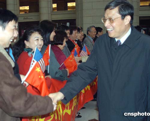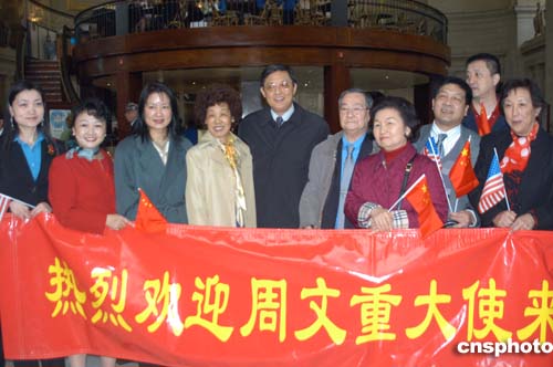 中國新任駐美大使周文重當(dāng)?shù)貢r間四月三日中午抵達美國首都華盛頓履新,受到當(dāng)?shù)厝A人僑學(xué)界代表的熱烈歡迎。