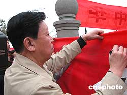 2005年是中國第一個(gè)資產(chǎn)階級政黨中國同盟會成立100周年。在同盟會中與孫中山先生并肩作戰(zhàn)的黃興先生,是中國近代史上著名的資產(chǎn)階級革命家。4月5日,黃興的孫子黃偉民來到位于長沙岳麓山上的黃興墓碑前簽名紀(jì)念。作者:肖前輝