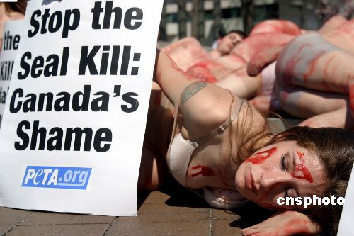 4月6日,數(shù)十名動物保護組織成員躺在加拿大駐美國大使館外,抗議加拿大政府獵殺海豹。作者:Ic/cnsphoto