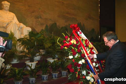 今天的參觀原本不在勞爾此次北京之行的行程安排當(dāng)中,中方應(yīng)勞爾的要求臨時(shí)增加了這項(xiàng)活動(dòng)。勞爾于今天下午四點(diǎn)多抵達(dá)毛主席紀(jì)念堂,在北門(mén)外下車(chē)后步行來(lái)到紀(jì)念堂內(nèi)毛主席座像前,敬獻(xiàn)花圈并三鞠躬致敬。隨后,勞爾一行靜靜地瞻仰了毛主席遺容。