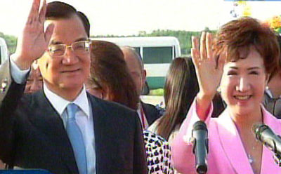 飛機抵達后,祿口國際機場兩輛客梯車分別在飛機的前、后艙門接參訪團成員走出機艙。連戰(zhàn)和夫人方瑀自前艙門走出機艙,并揮手向歡迎的人群致意。兩名少年兒童迎上前去,向他們敬獻鮮花。